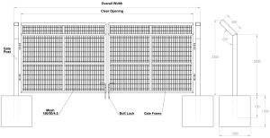 Catalog No. | Total Height | Total Width | Clear Opening | Beam Length | Posts & Frame Profile | Gate Frame Profile | Mesh |